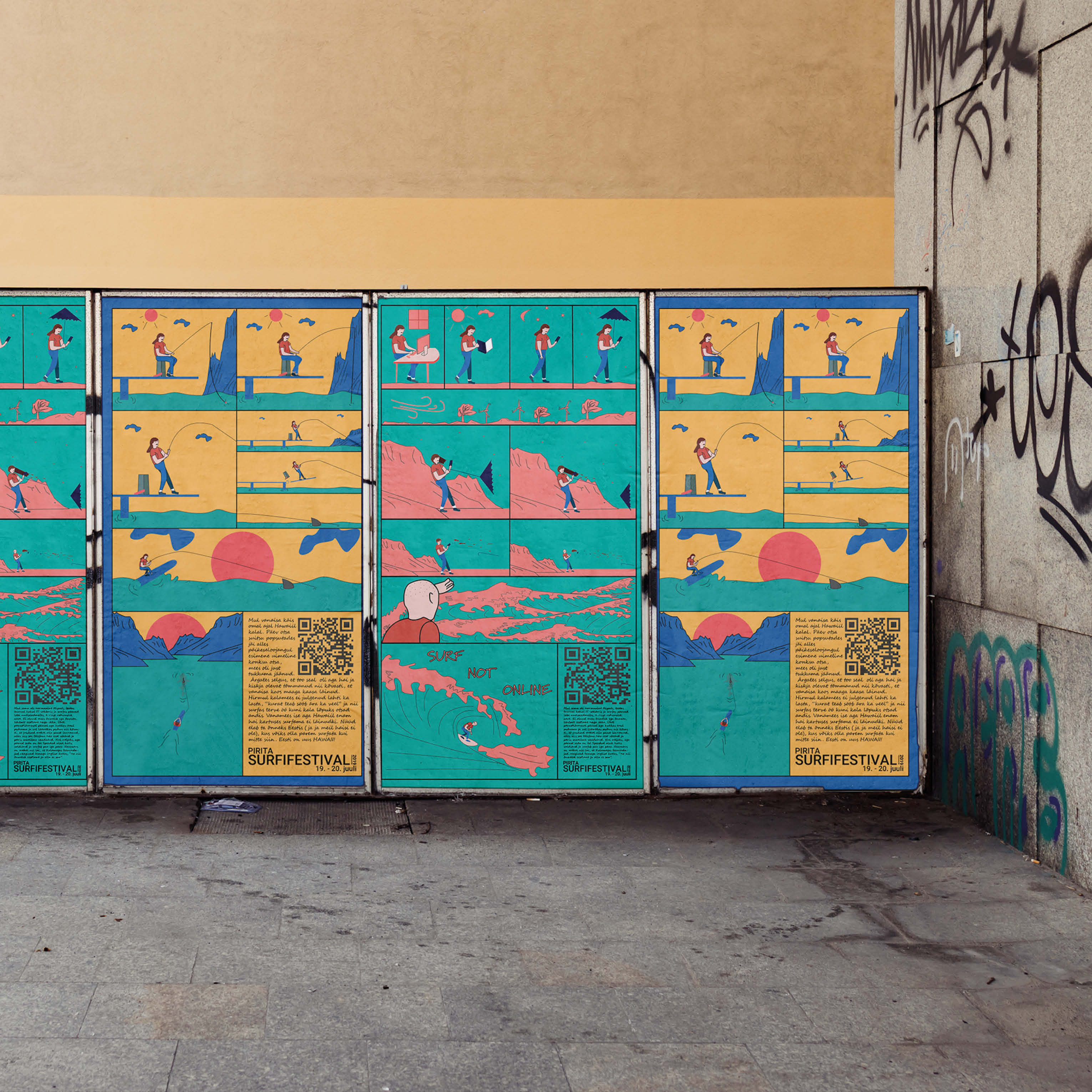 For the Pirita Surfifestival we were tasked with crafting a captivating visual identity that would resonate with the event's trendy atmosphere and exude a positive vibe. The end result was a surreal cartoon-inspired design. Our approach aimed to steer clear of overwhelming the audience with excessive advertising and, instead, centred on arousing curiosity.